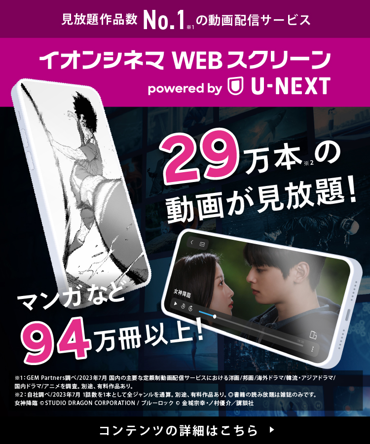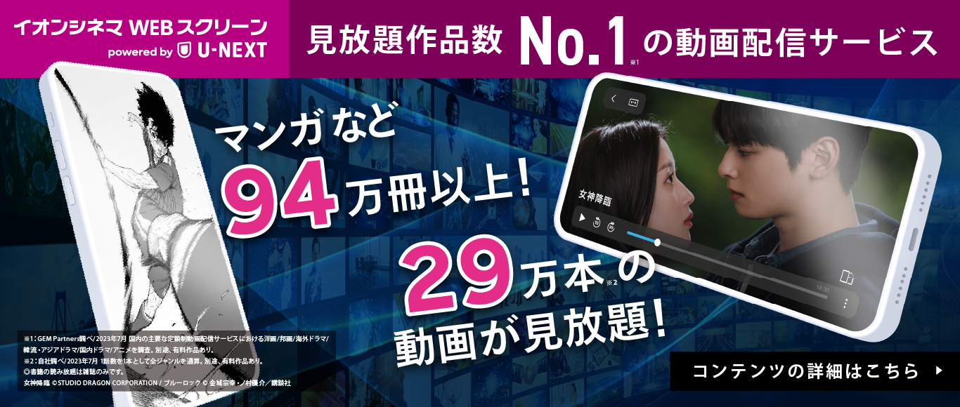 イオンシネマWEBスクリーンでは、劇場公開を終えた話題の映画から、ドラマやアニメまで、さまざまな作品を配信中です。