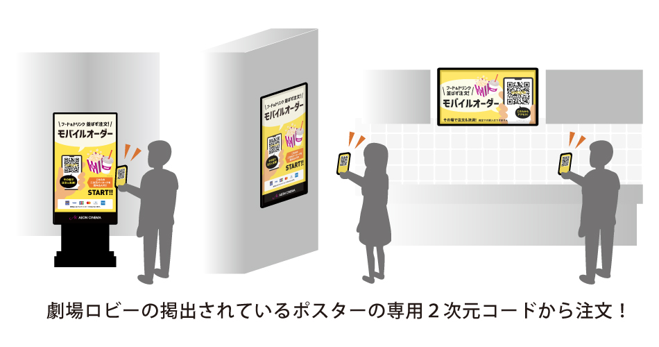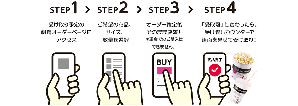 ※「モバイルオーダー」では、飲食売店(ドリンク・ポップコーン)引換券はご利用いただけません。飲食売店(ドリンク・ポップコーン)引換券付きチケットをお持ちのお客さまは劇場売店のセルフオーダーもしくは有人のレジをご利用ください。