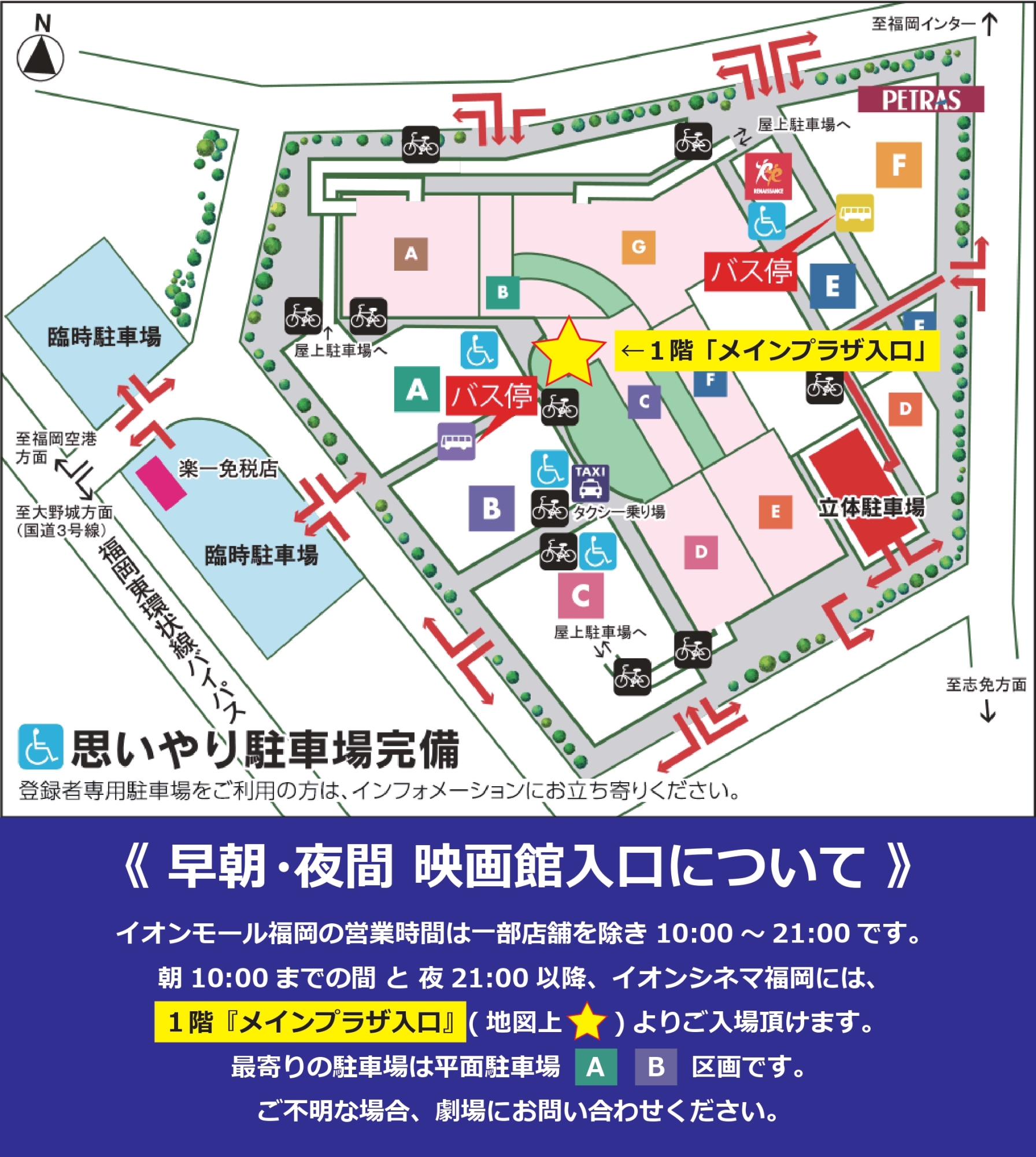 イオンモール福岡の営業時間は 10:00~21:00 です。(※一部店舗のぞく)朝10:00まで、又、21:00以降、にイオンシネマ福岡へお越しの際は、【1階「メインプラザ入口」(A1入口)】よりご入館いただけます。なお、最寄りの駐車場は平面駐車場「A」「B」区画となります。詳しくは画像をご確認ください。