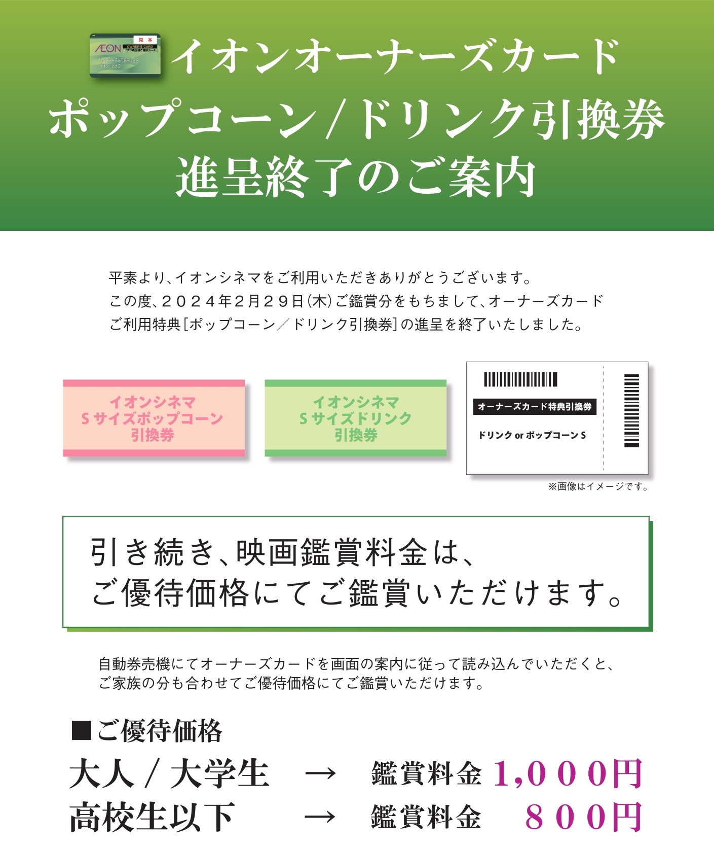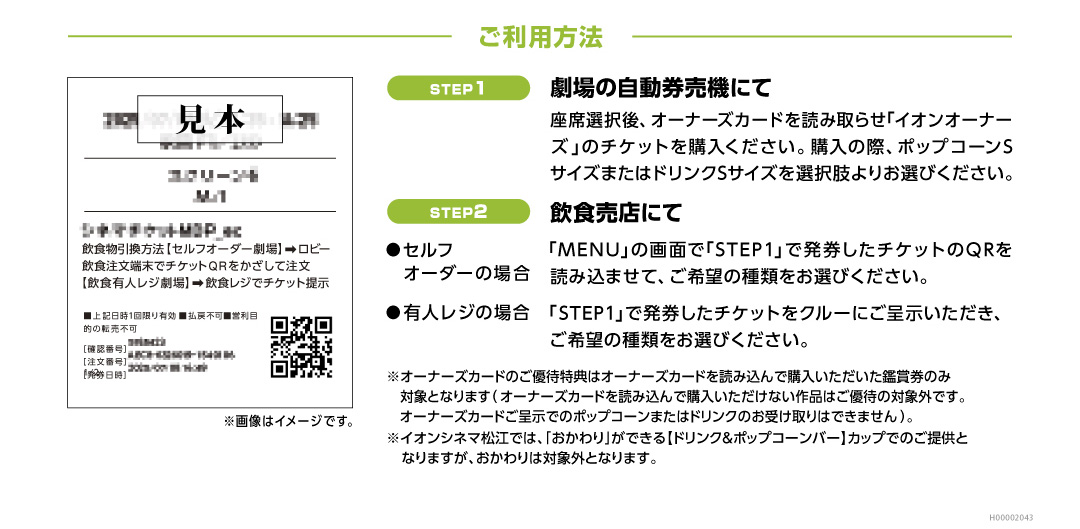 ※ポップコーンまたはドリンクのご提供はオーナーズカードを読み込んで購入いただいた鑑賞券のみ対象となります(オーナーズカードを読み込んで購入いただけない作品はご優待の対象外です。オーナーズカードご呈示でのポップコーンまたはドリンクのお受け取りはできません)。