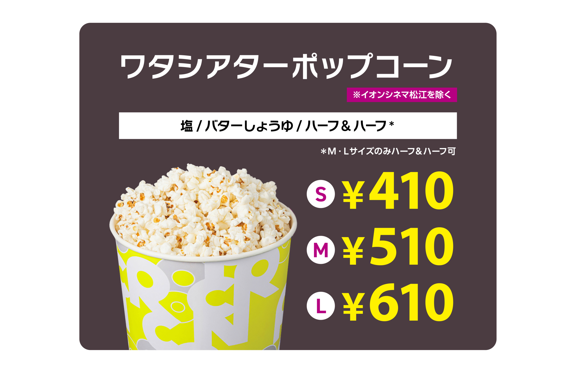 ・ポップコーンは、塩/バターしょうゆ/ハーフ&ハーフの中からお選びください。ハーフ&ハーフはM/Lサイズのみ。 (板橋、ワンダー、須坂は、キャラメルもお選びいただけます。)