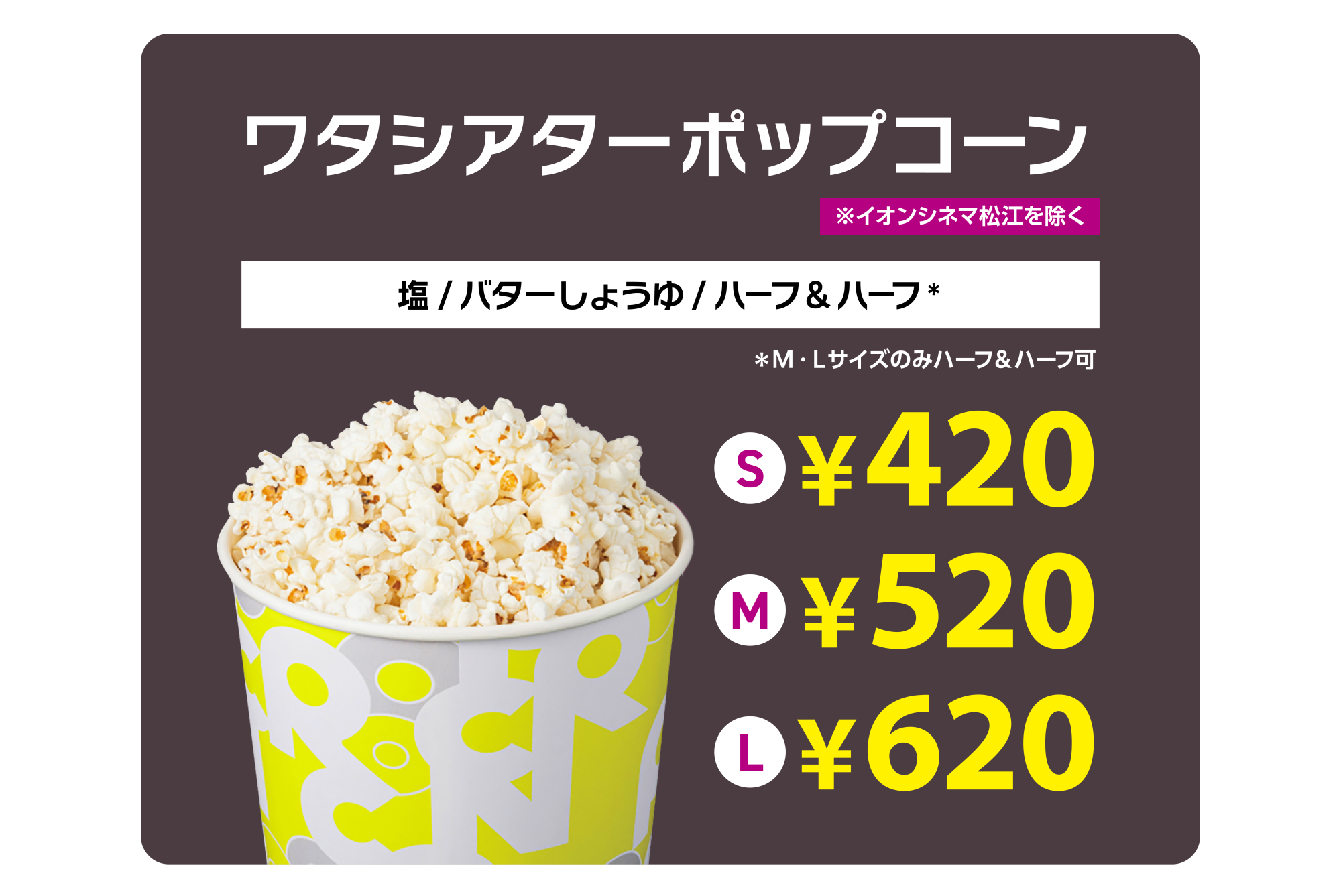 ・ポップコーンは、塩/バターしょうゆ/ハーフ&ハーフの中からお選びください。ハーフ&ハーフはM/Lサイズのみ。 (幕張新都心、板橋、ワンダー、須坂、米沢は、キャラメルもお選びいただけます。)