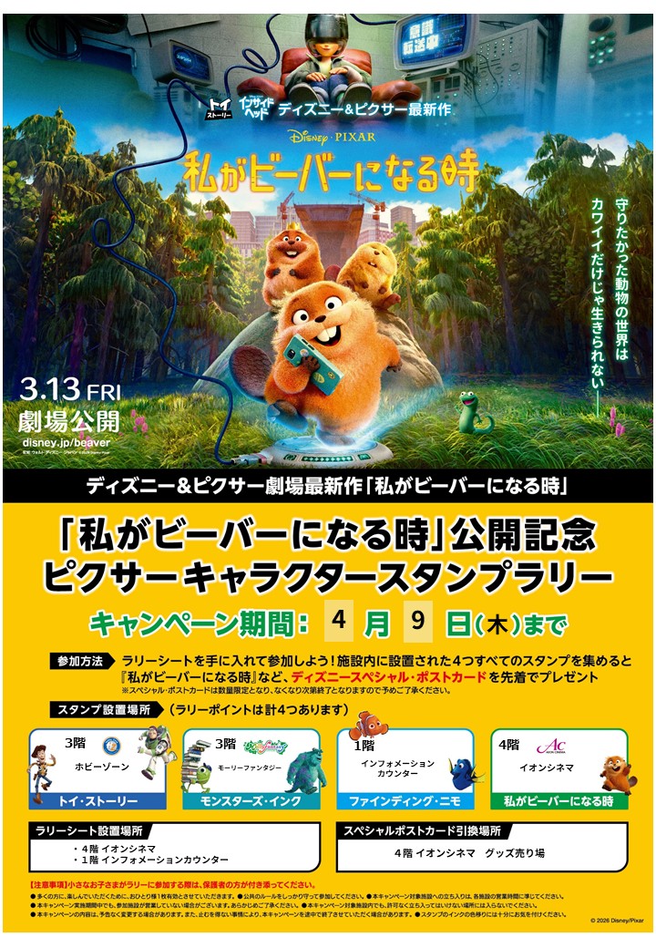 イオンモール須坂内に設置された4つのスタンプを全て集めると『私がビーバーになる時』など、ディズニースペシャルポストカードを先着でプレゼント!