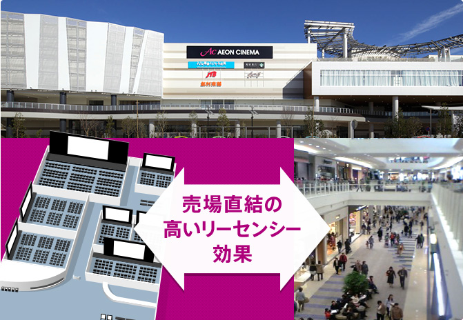 映画館の来場者は、映画鑑賞前後に、ショッピングセンターのあらゆる商品の購入やサービスの提供を受ける機会に直結しており、イオンシネマは広告やプロモーションに極めて適した立地特性にあるといえます。