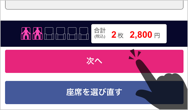 Note: The [次へ進む] button color changes to pink when you select the seats for the number of booked tickets and becomes tappable.