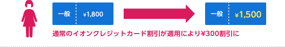 イオンシネマ劇場窓口、自動券売機、または『e席リザーブ』で、一般通常料金のチケットをイオンマークのクレジットカード払いでご購入いただくと、割引特典がございます。