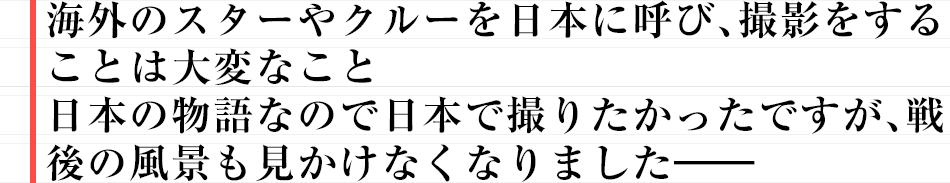 特に海外のクルーやスターとなると大変です。日本での撮影は結局、2日間だけでした。