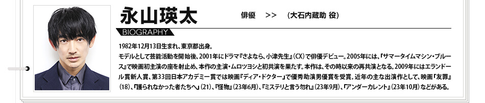 歌舞伎であったり、お正月に忠臣蔵が観られる時代があったり、おそらく世代によって捉え方はきっと違うんでしょうけれども、すごい大先輩方が演じられてきた忠臣蔵がベースにあります。ただ、今回の映画に関しては、史実であったり、そういったところは深く考えず、今作の大石内蔵助を作っていきました。