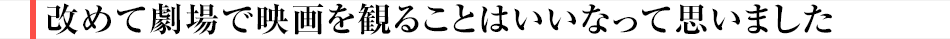 そうですね。僕自身もやっぱり劇場で映画を観ることはいいなって思いました。子供と一緒に映画を観ることもありますが、お父さんとしてだけでなく、自分が観たいと思う作品もあるので、ひとりで観に行ったり、奥さんと観に行ったりしてもいいかなと改めてまた思いましたね。
