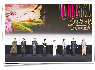 豪華出席者は、まだ本当の強さを知らない、後の“悪い魔女”エルファバ(シンシア・エリヴォ)役の高畑充希さん、まだ本当の優しさを知らない、後の“善い魔女”グリンダ(アリアナ・グランデ)役の清水美依紗さん、ウィンキー国の王子、フィエロ(ジョナサン・ベイリー)役の海宝直人さん、グリンダに好意を寄せているボック(イーサン・スレイター)役の入野自由さん、グリンダの友人でファニーの相棒のシェンシェン(ブロンウィン・ジェームズ)役のゆりやんレトリィバァさん、シズ大学で歴史学を教えるヤギのディラモンド教授(ピーター・ディンクレイジ)役の山寺宏一さん、エメラルドシティでエルファバやグリンダを誘う語り手役の吹替を務めた武内駿輔さん、さらに日本語吹替版の台詞演出を務めた三間雅文さんが登壇! 作品の見どころなどを大いに語りました!
