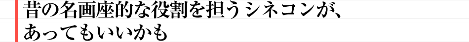 それと、近所にあったみたいな昔の名画座的な役割を担うシネコンが、あってもいいかもですよね。
