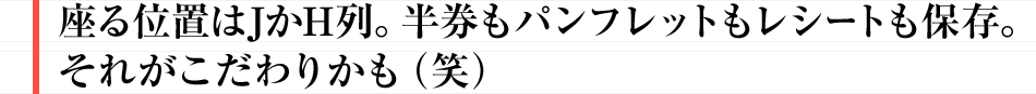 それは作品に寄ります。ポップコーンが進みそうな作品の時は買いますし、そうじゃないじっくり観たい作品の時は何も買わないです。ただ座る位置は、たいがいJかH列です。スクリーンの大きさを調べて、より大きなスクリーンの場合、J列に座ります。J列が埋まっていると、H列にします。しかも半券を全部とっておく主義で、パンフレットも必ず買います。全部自分で買いたいんです。レシートも保存。それがこだわりかもしれないです(笑)。