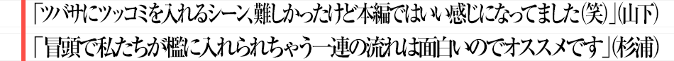 「私の演じたツバサが、『全集中!ラブの呼吸!』のセリフでケーキを切って食べてしまうところが楽しいと思います。その後の、ツバサをすごくシュールな目で見ながら“『ツバサの刃』?”って言う時のコハナ(山下)の顔も面白いし、個人的にすごく好きなので、そのふたつをセットで観てほしいです(笑)」