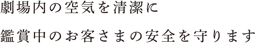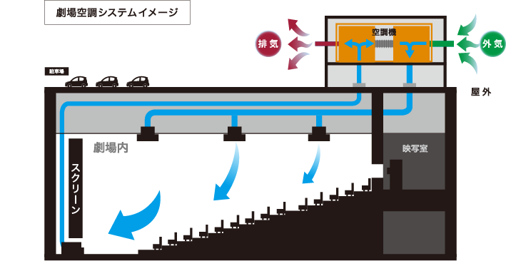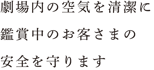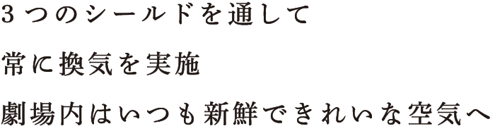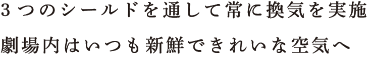 劇場内の空気は、常に換気により総入れ替えをしています。通常の入れ替えではなく、3つのシールドを通しているため、新鮮でよりきれいな空気で劇場内を満たします。