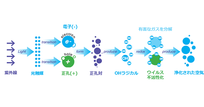 紫外線を光触媒に照射することで、ウイルスを分解すると同時にバクテリア、ウイルスなど、一般的に建物内で検出される微生物を不活性化します。