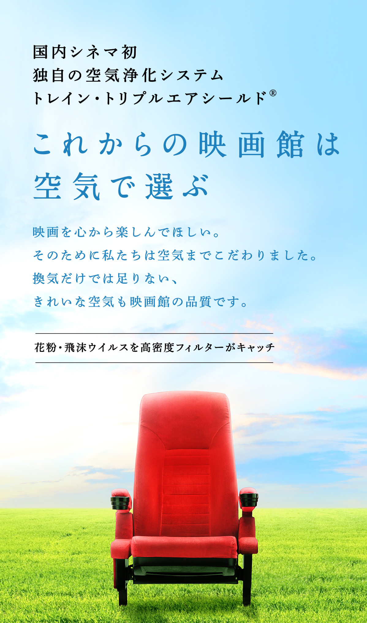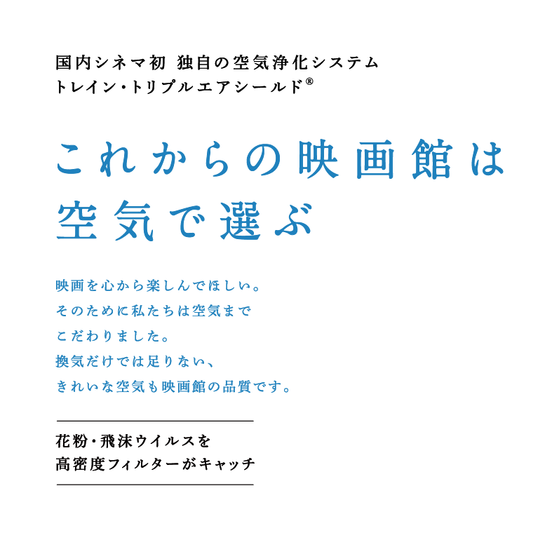 トレイン・トリプルエアシールド®はイオンシネマ独自の浄化システム。国内で初めて、導入されたこの大型空気浄化システムは、3つのシールドで大気中のウイルスを不活化、劇場内への侵入を防ぎ、安心して映画鑑賞ができるよう、劇場内の安心を保っていきます。