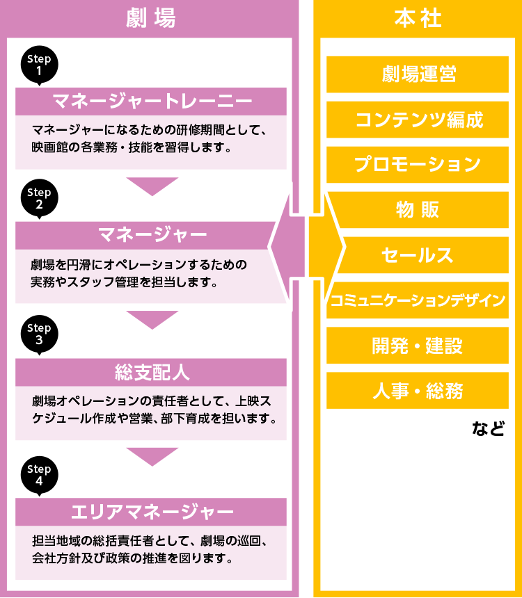 担当地域の総括責任者として、劇場の巡回、会社方針及び政策の推進を図ります。