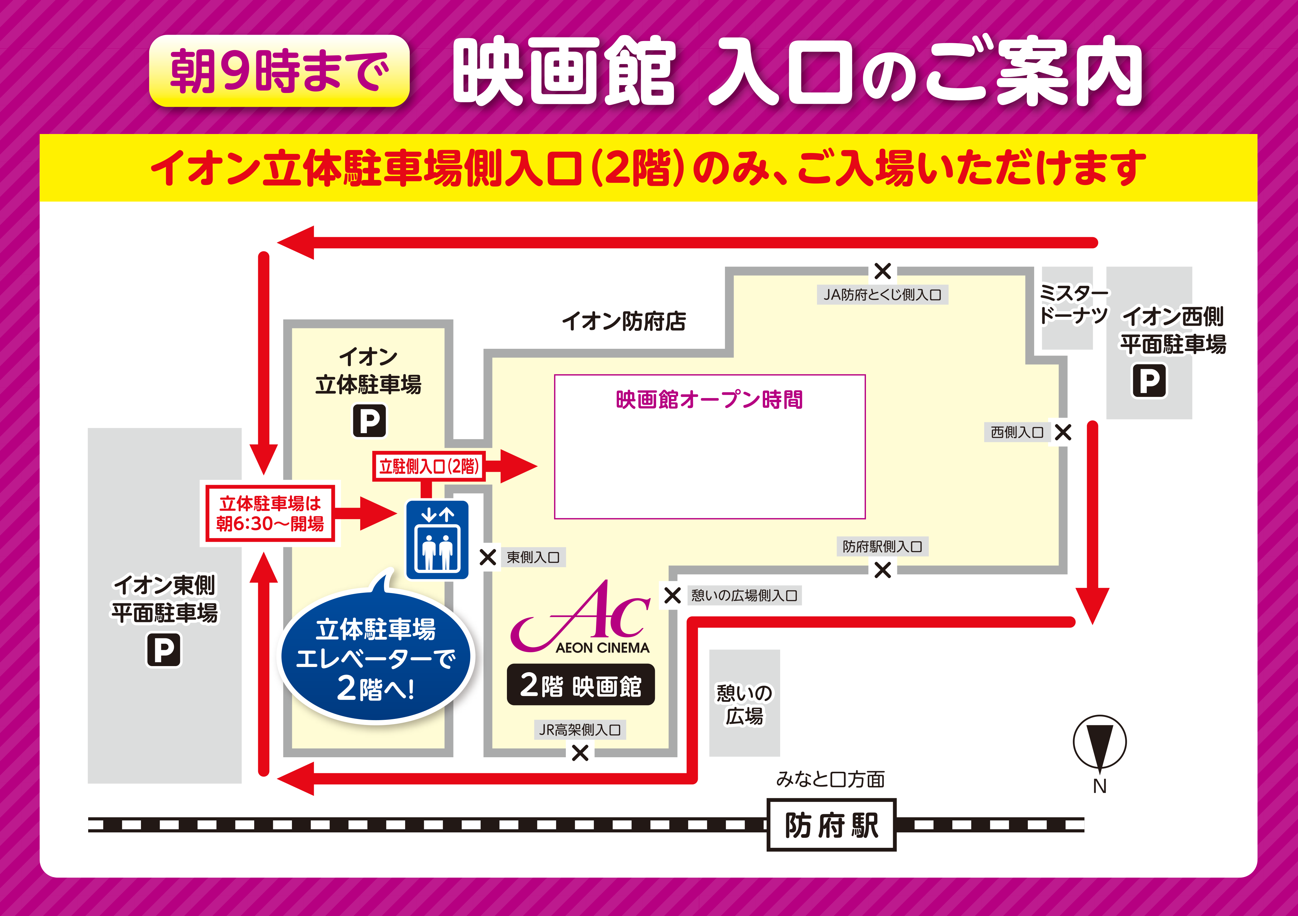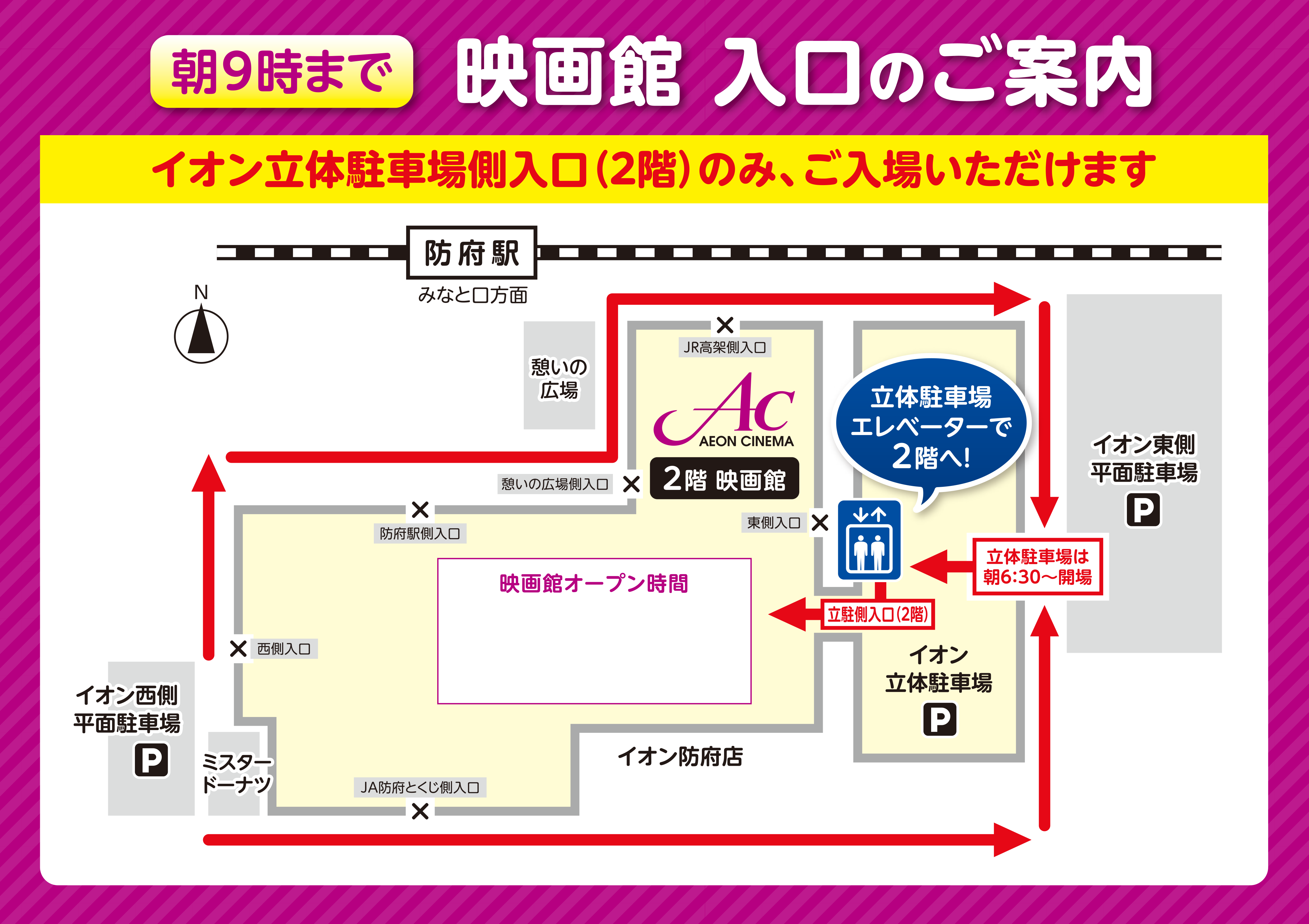 イオン防府店オープン時間まで、および、夜21:00以降は、2F立体駐車場入口よりご入場ください。