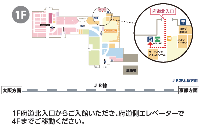 朝10時までにご来館のお客さまは、4Fイオンシネマ入口(5F立体駐車場入口)、もしくは1F府道北入口(コメダ珈琲店さま横入口)よりエレベーターにてご来場くださいませ。