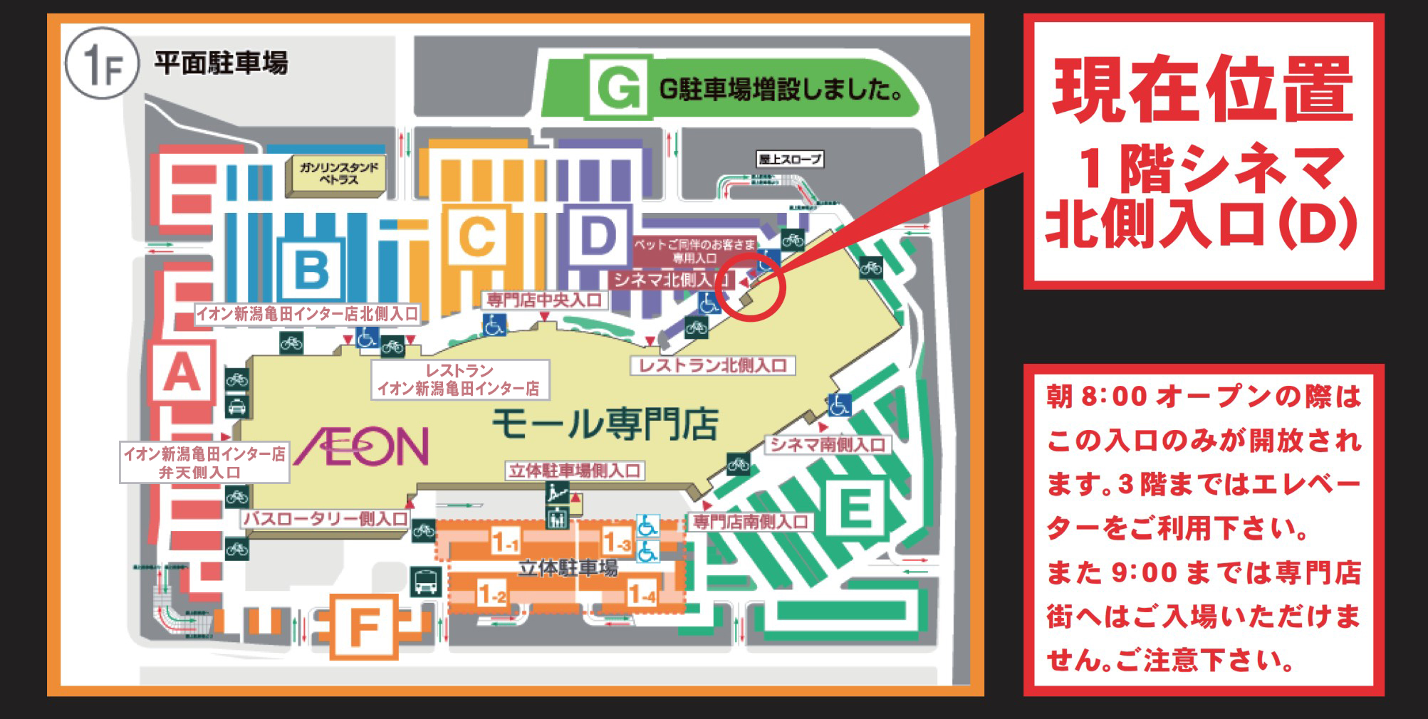 イオンモール開店前(朝9:00)までの映画館の入口は、イオンモール1階 シネマ北側入口(D)の1ヶ所のみでございます。お車でお越しの際は、イオンモール1階 シネマ北側入口(D)付近に駐車されますとスムーズにご来場頂けます。詳しくはイオンモール新潟亀田インターのアクセスガイドをご確認ください。