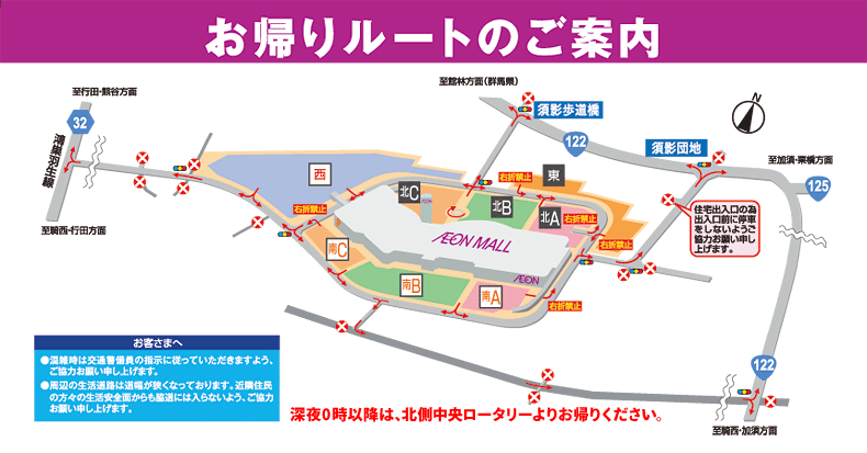 周辺の生活道は道幅が狭くなっております。近隣住民の方々の生活安全面からも脇道に入らないよう、ご協力をお願い申し上げます。