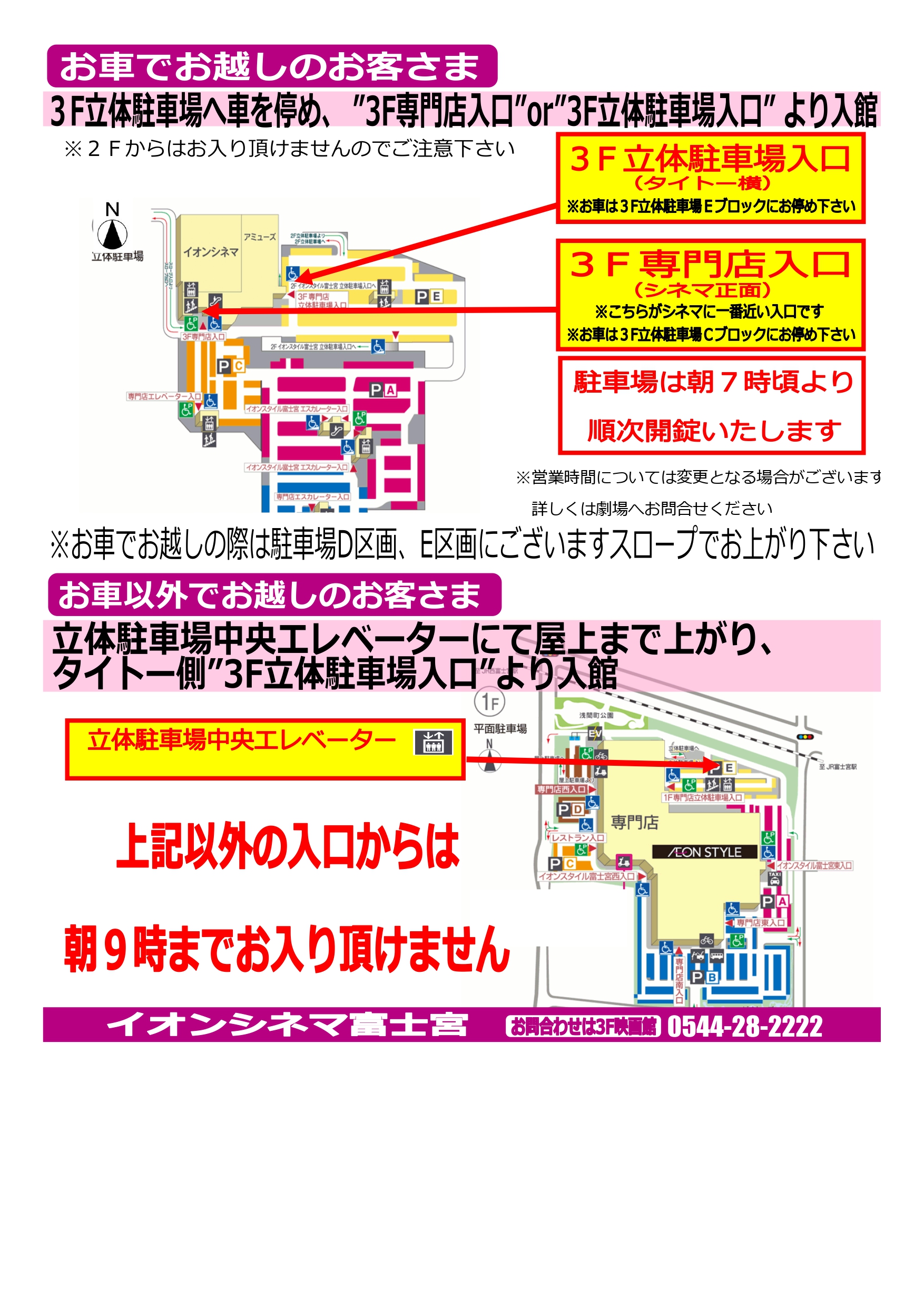 イオンモールオープン前に映画館にお越しのお客さまは【3階立体駐車場入口】または【3階専門店入口】よりご入館ください。