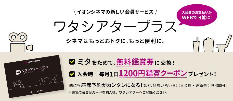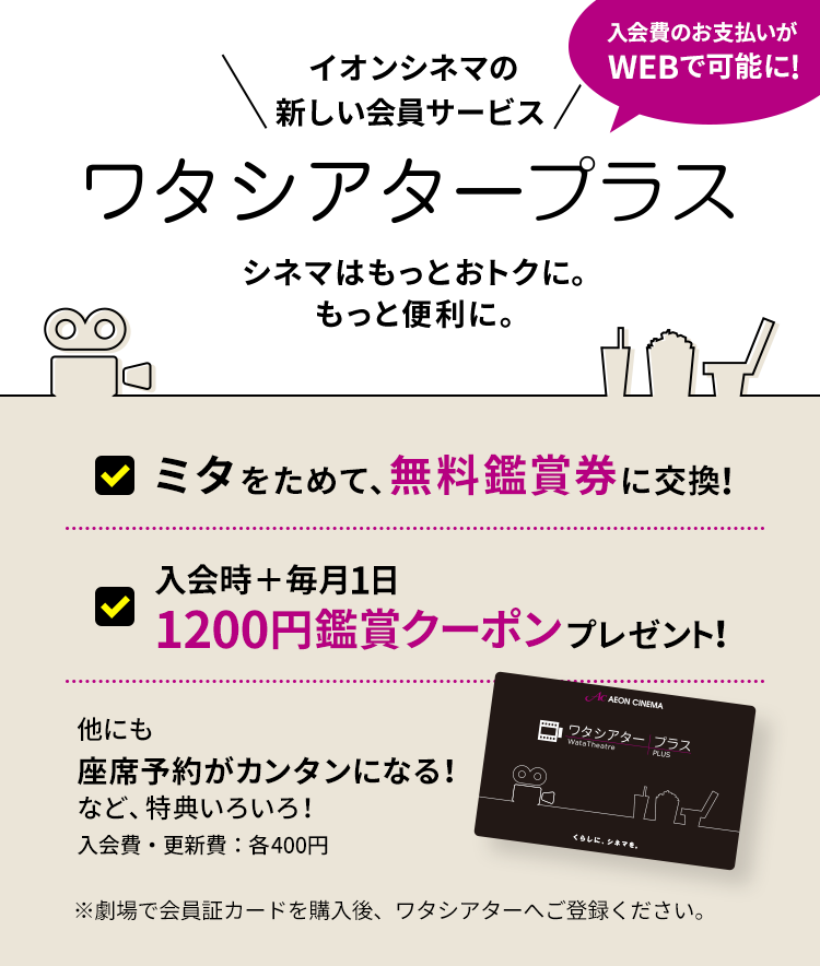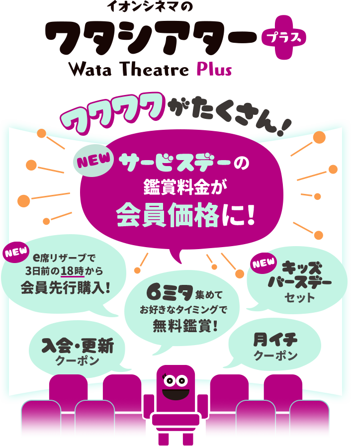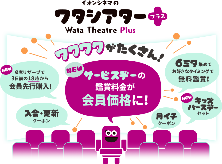 映画を観るごとにたまるミタや、たまったミタを交換できるプログラム、グッズがあたるキャンペーンなど、観れば観るほど映画ライフが楽しくなる会員サービス「ワタシアター」のサービスをすべてご利用になれる会員です。
