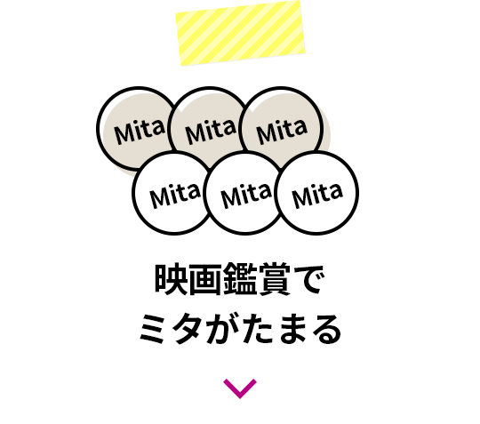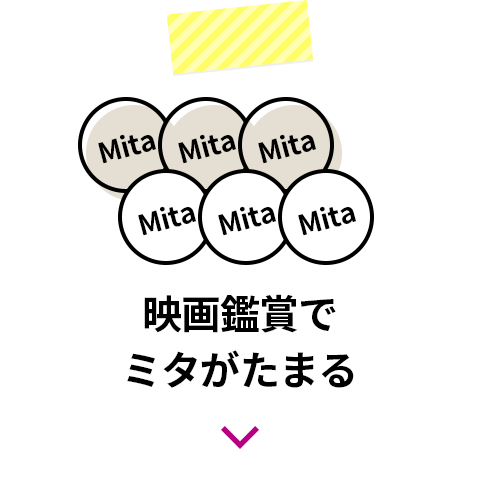 ワタシアタープラス会員のお客さまは、映画を1回観るごとに、1ミタずつたまります。たまったミタは、6ミタ無料鑑賞などに交換可能です。なお1ミタ毎に有効期間が異なっており、獲得日から3年間が有効期間になります。(有料鑑賞された場合のみ、ミタがたまります。※1)